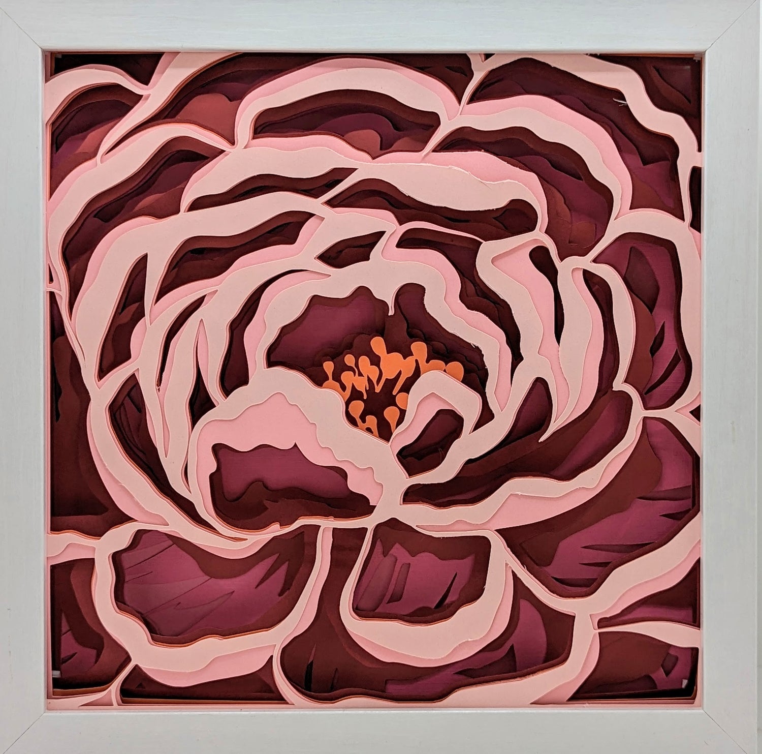 These shadow boxes are 10"x10"x1.75" (unless otherwise specified) and contain intricately cut colorful paper...