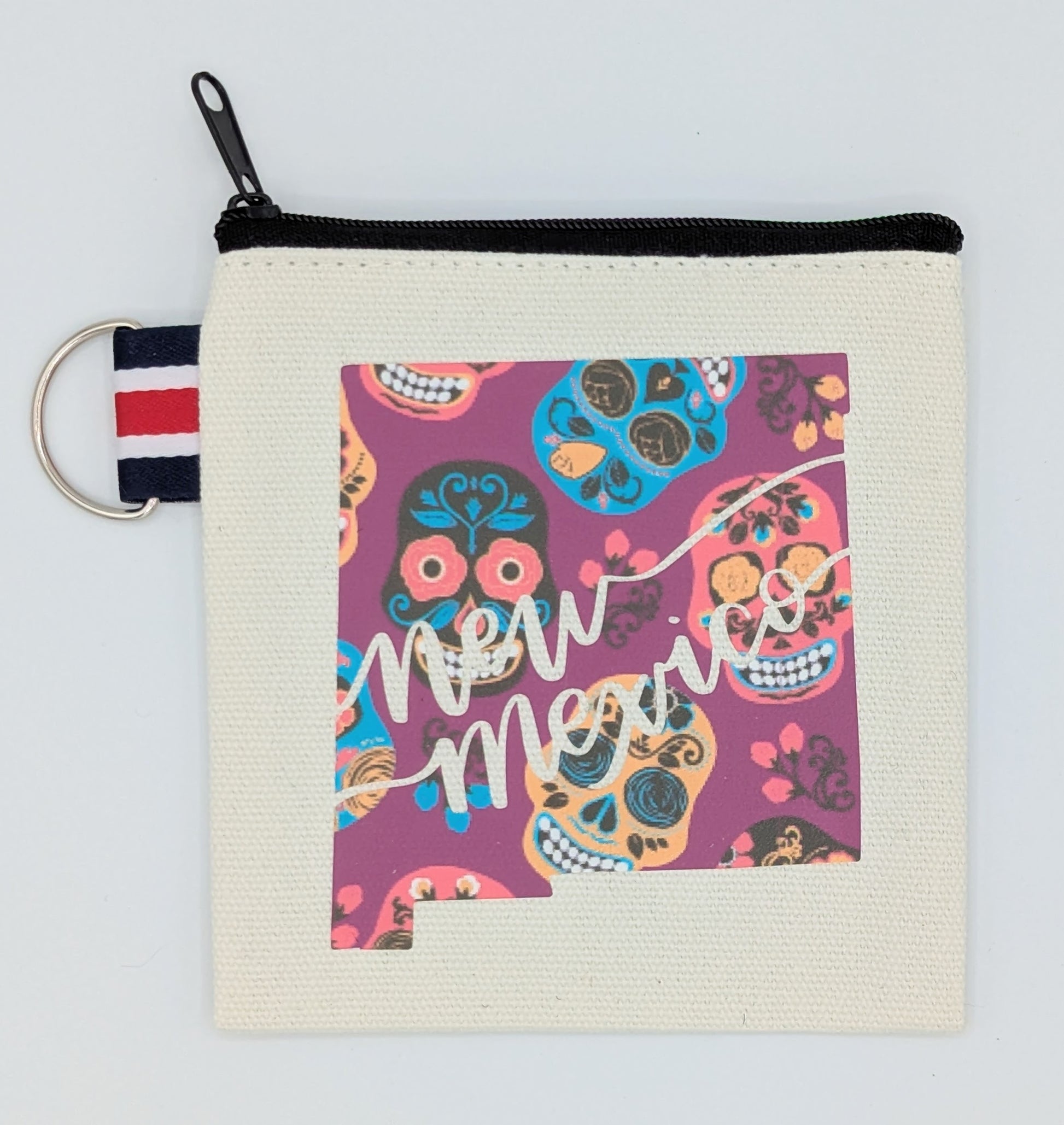 This white zippered cotton canvas bag, 4.5"x4.5", has the shape of the state of New Mexico on it in vinyl. The vinyl is decorated with fun sugar skulls in vibrant colors including turquoise with a maroon/dark red background. It also has the words "New Mexico" in cursive cut out of the vinyl. Give it to your favorite New Mexican or as a souvenir of an awesome vacation in the Land of Enchantment.